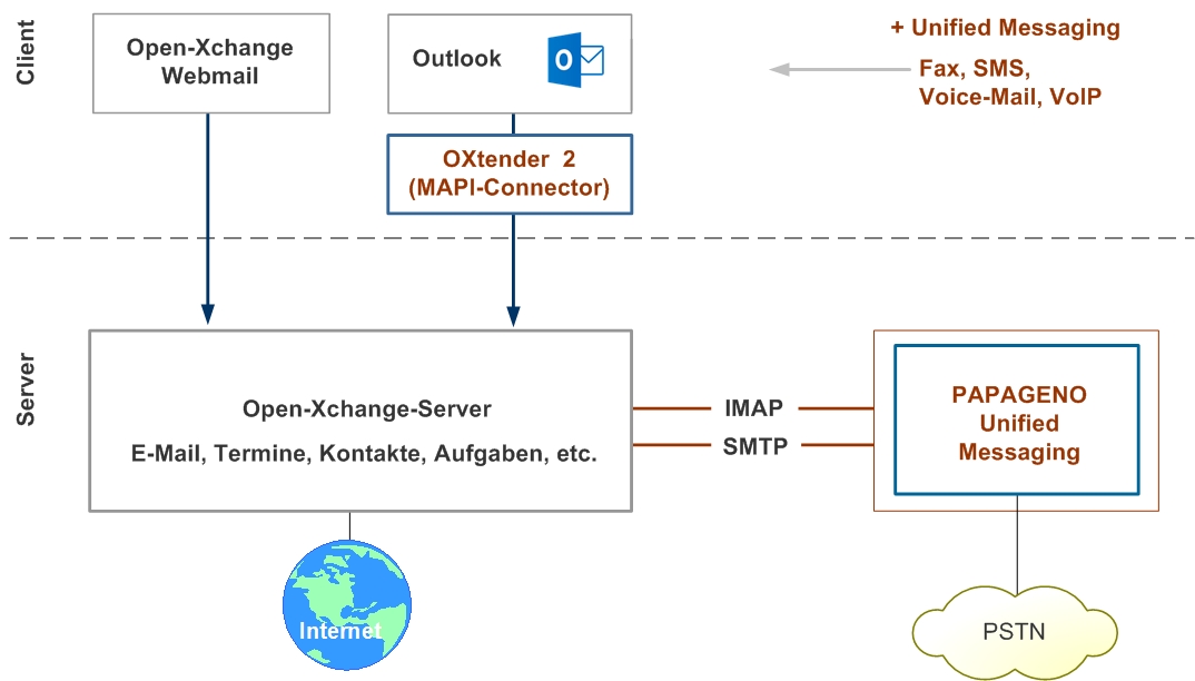 Open-Xchange Webmail und Outlook können mit PAPAGENO um Dienste wie Fax, Voice-Mail und SMS erweitert werden. Und das sowohl über klassische als auch über VoIP-Telefonie. Von unterwegs aus bietet PAPAGENO die Möglichkeit, über das Telefon auf die Daten zugreifen.